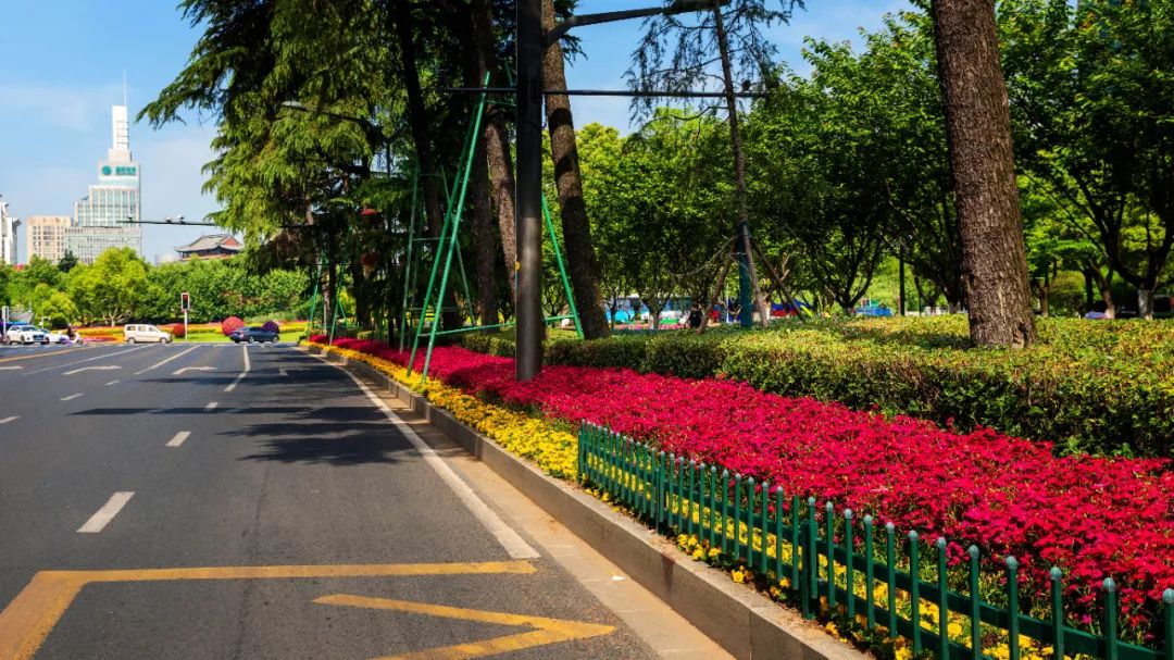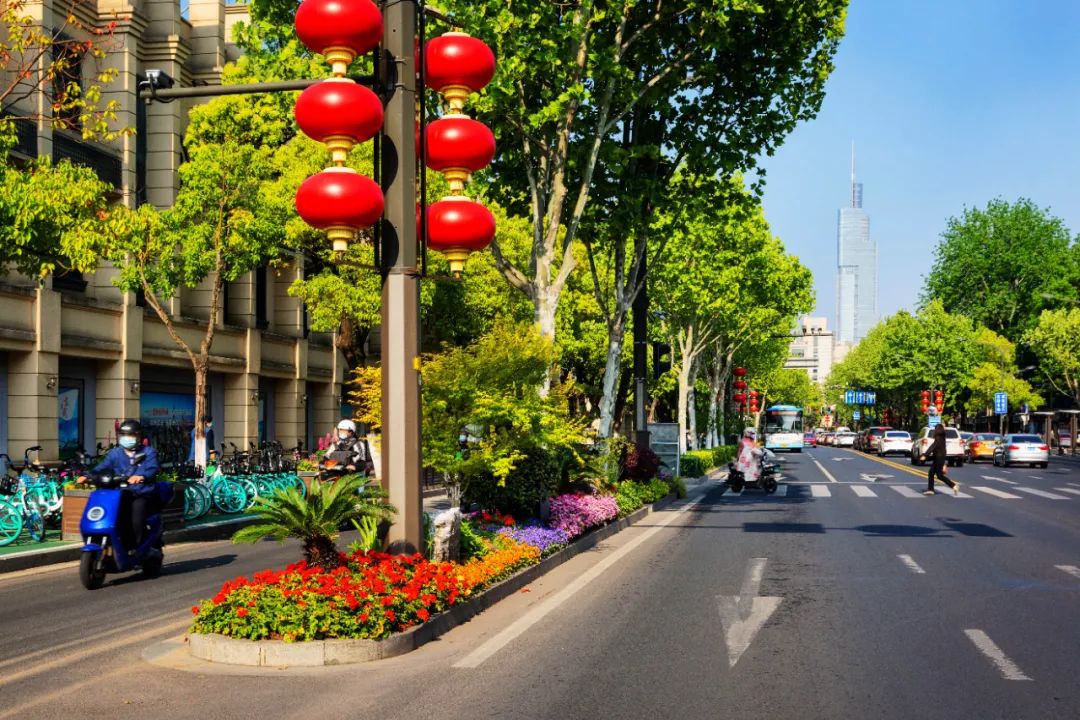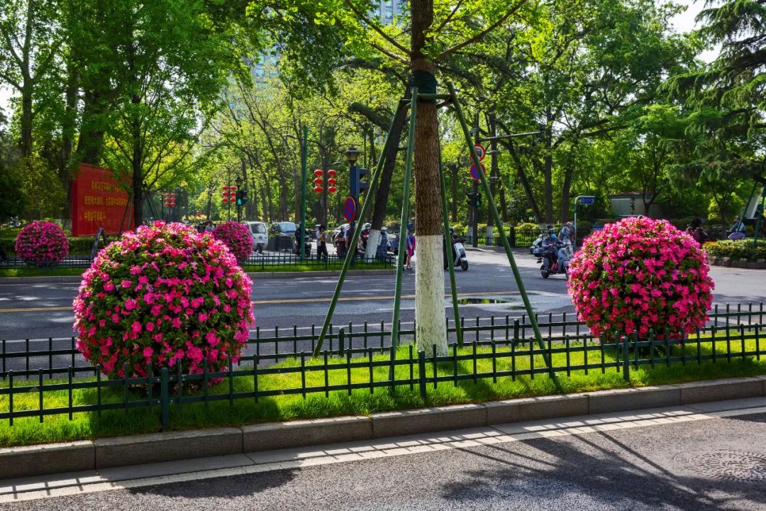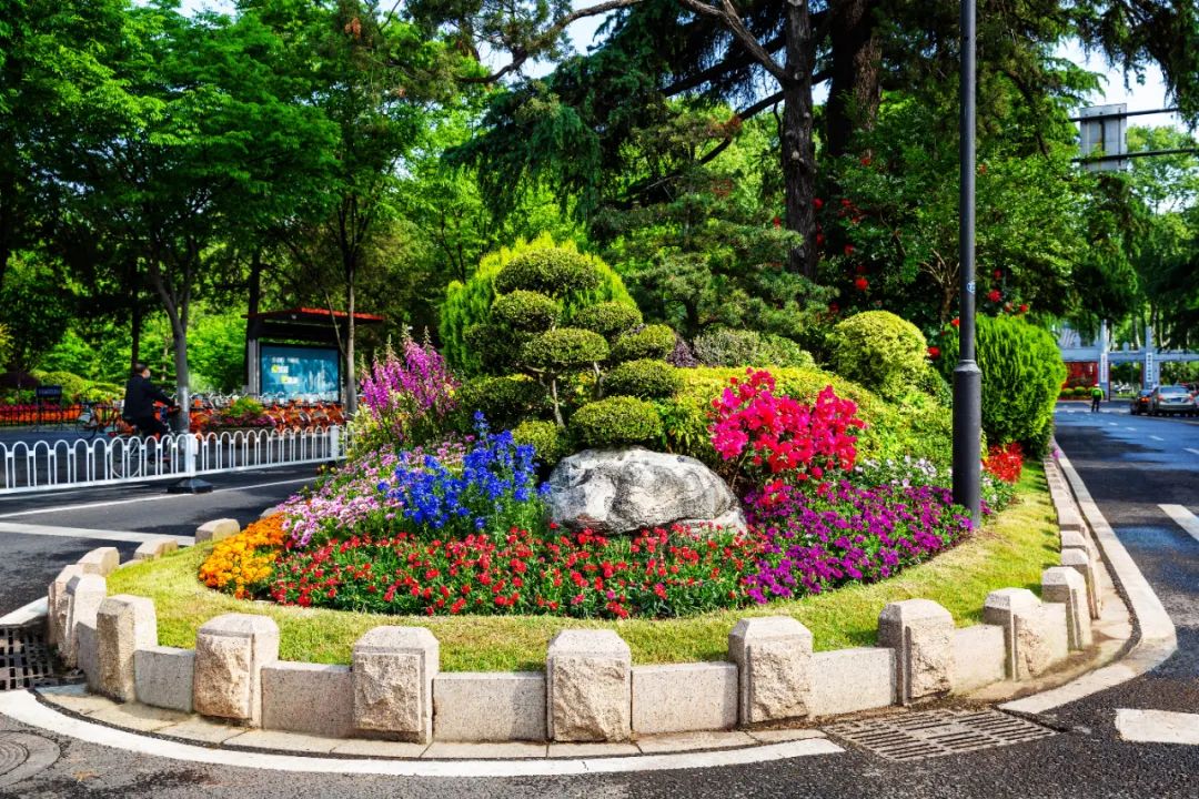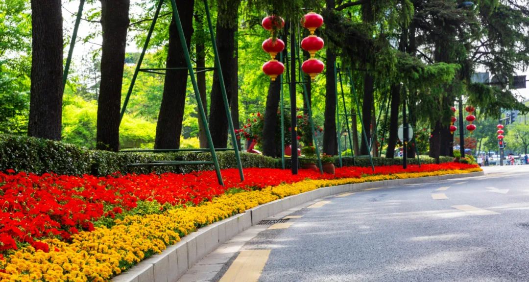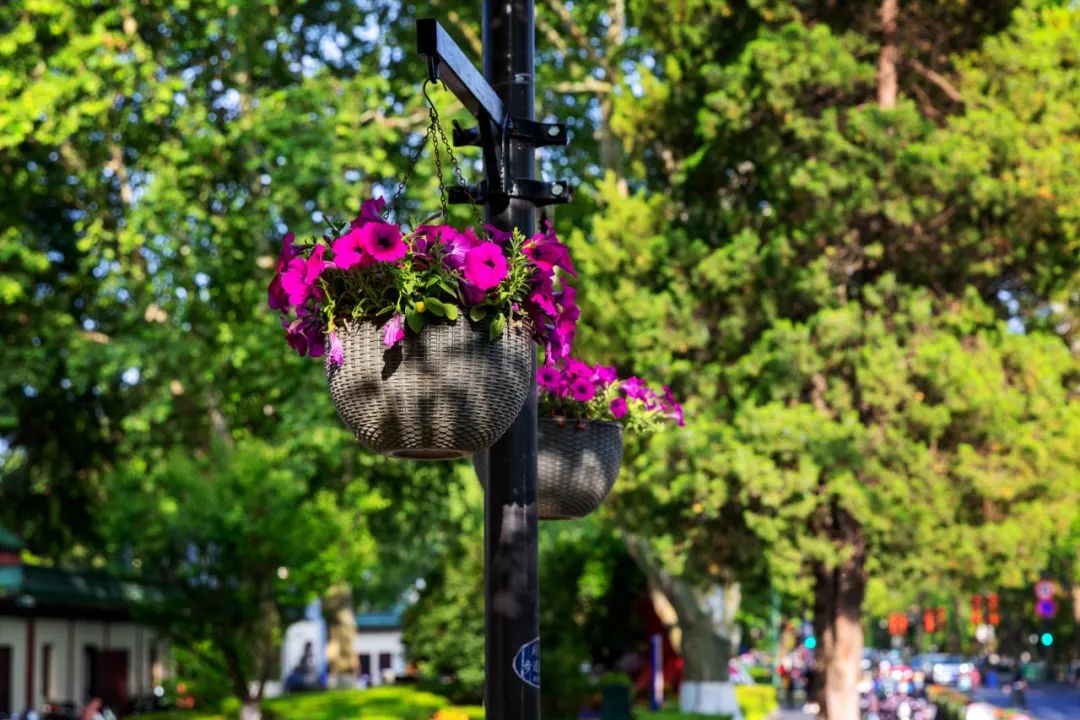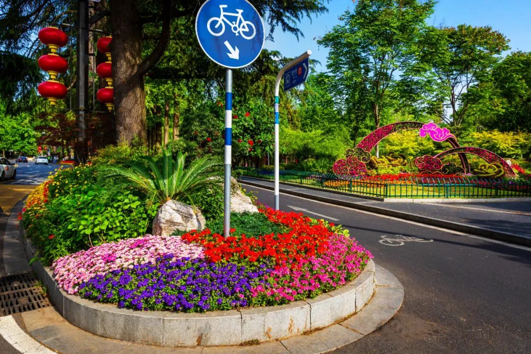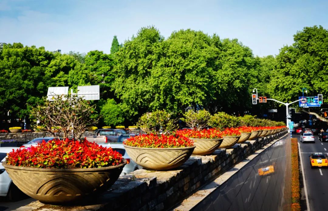 對市府門前路、長江路、九華山站、荔枝廣場、中山門城墻等重要節點容器花箱、花球、燈桿掛花及新街口東北角綠地進行花卉布置,選用朱蕉、羽扇豆、毛地黃、天竺葵、桑貝斯鳳仙、金雀、澳洲朱蕉、變葉木、四季海棠、鼠尾草、歐石竹、垂掛牽牛等花卉,以色彩鮮明、層次豐富的設計感,裝扮城市街角,營造濃厚的節日氣氛。