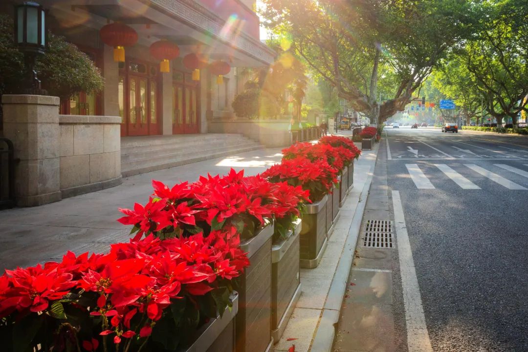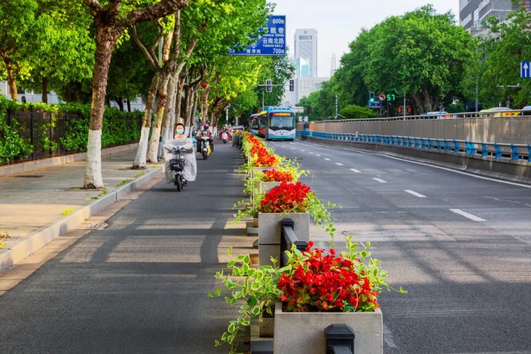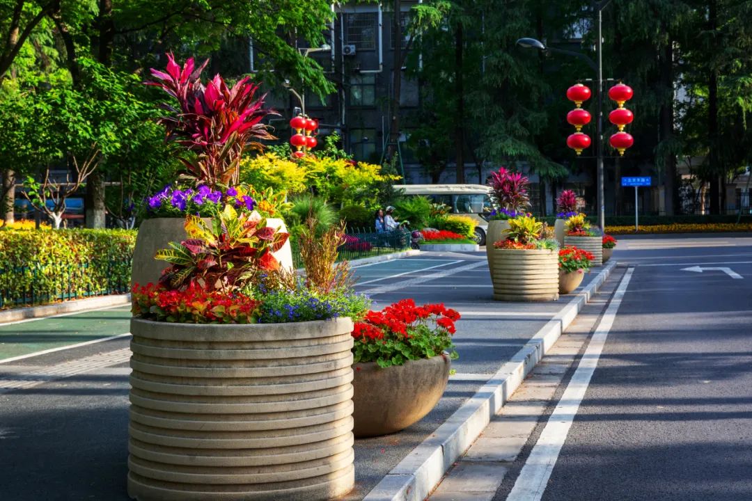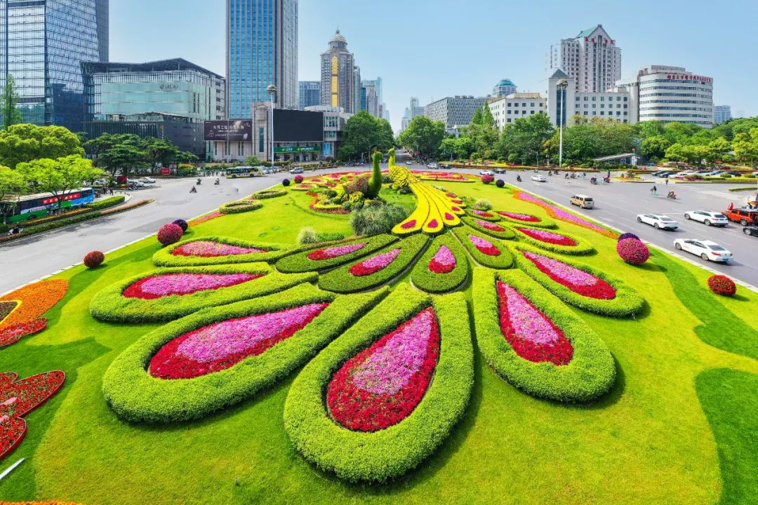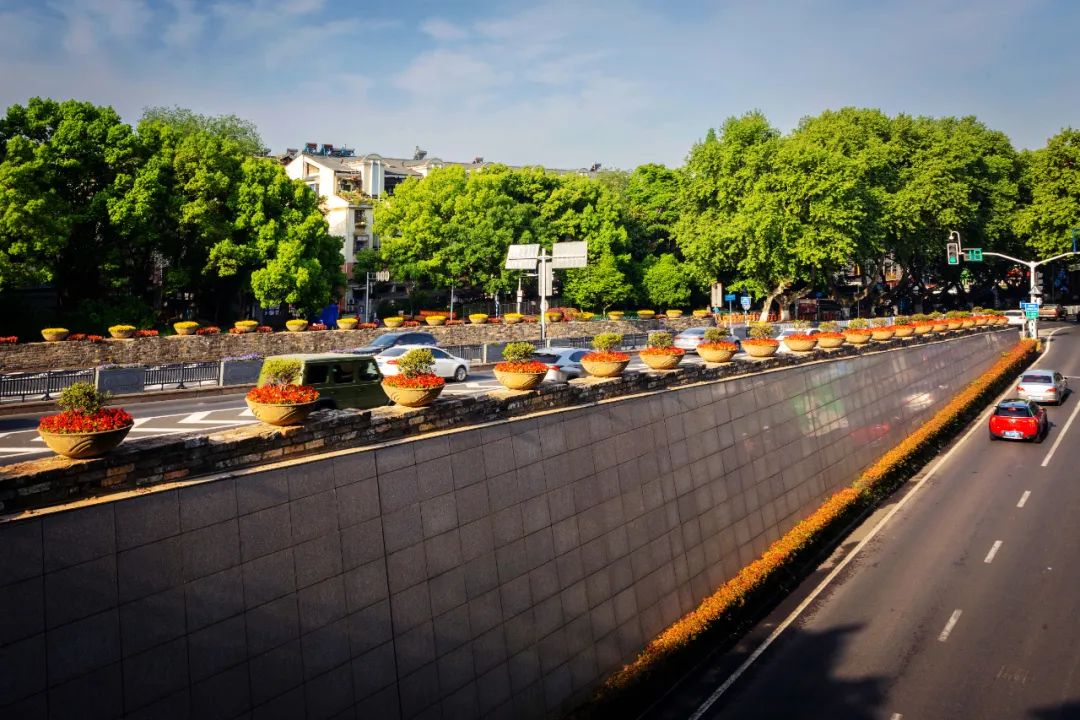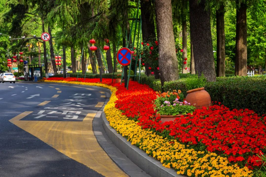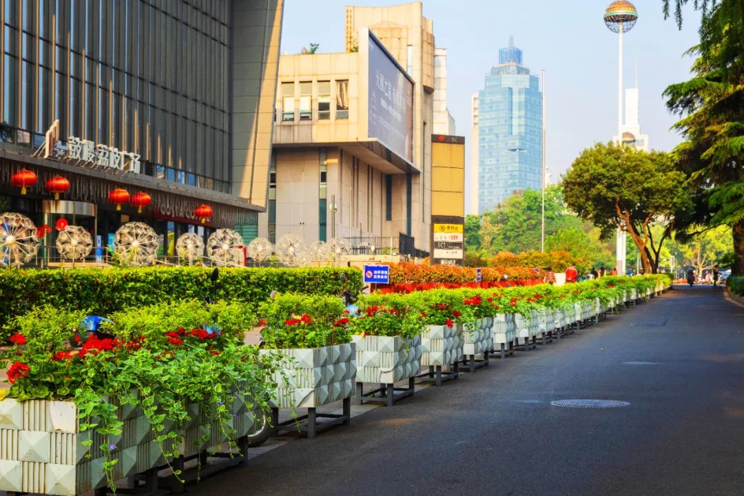 對市府門前路、長江路、九華山站、荔枝廣場、中山門城墻等重要節點容器花箱、花球、燈桿掛花及新街口東北角綠地進行花卉布置,選用朱蕉、羽扇豆、毛地黃、天竺葵、桑貝斯鳳仙、金雀、澳洲朱蕉、變葉木、四季海棠、鼠尾草、歐石竹、垂掛牽牛等花卉,以色彩鮮明、層次豐富的設計感,裝扮城市街角,營造濃厚的節日氣氛。