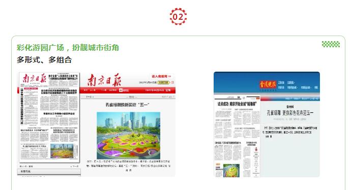 鼓樓中心廣場孔雀綠雕換上新妝、“五福梅花”和12個錯落的幸福花球以色彩清新的花卉布置,營造出“‘梅’好金陵”的春天氣息。4月25日,《南京日報》、《金陵晚報》等多家媒體對鼓樓中心廣場孔雀綠雕迎五一換妝進行報道。