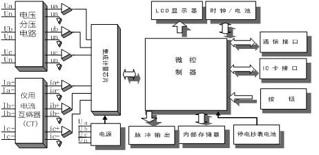 本產(chǎn)品由電流互感器、集成計(jì)量芯片、微控制器、溫補(bǔ)實(shí)時(shí)時(shí)鐘、數(shù)據(jù)接口設(shè)備和人機(jī)接口設(shè)備組成。集成計(jì)量芯片將來自電壓分壓,電流互感器的模擬信號轉(zhuǎn)換為數(shù)字信號, 并對其進(jìn)行數(shù)字積分運(yùn)算,從而精確地獲得有功電能和無功電能,微控制器依據(jù)相應(yīng)費(fèi)率 和需量等要求對數(shù)據(jù)進(jìn)行處理。其結(jié)果保存在數(shù)據(jù)存儲器中,并隨時(shí)向外部接口提供信息 和進(jìn)行數(shù)據(jù)交換,其原理框圖如圖 1 所示。