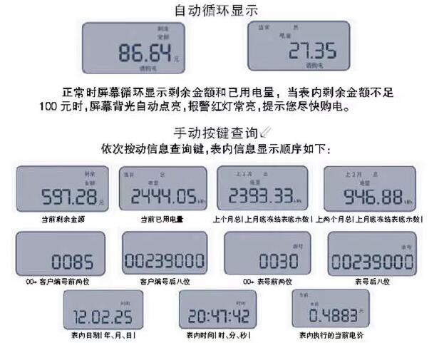 居民使用的智能電表可以自動循環(huán)顯示:當前剩余金額(表內還有多少錢)和當前有功總電量(您總共用了多少度電)。居民還可以通過按下智能電表上的查詢按鈕(顯示屏右下方唯一按鈕)查詢上個月的有功總電量(與當前表示數的差值為本月用電量)、前兩個月的有功總電量(與上個月的有功總電量的差值為上個月用電量)、客戶編號、表號、時間、日期、故障代碼、當前電價等信息。