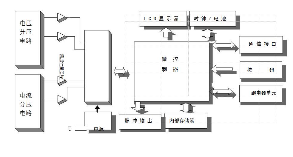 單相預付費智能電表工作原理如下,電流采樣網絡、電壓采樣網絡、計量集成電路組成電能計量單元;由微控制器、數據內卡、掉電檢測、日歷時鐘、繼電器單元組成數據處理單元。由電源、電池組成供電系統;由 LCD、校驗表輸出口、按鈕、輔助端子組成輸入輸出系統。其原理框圖如下圖所示: